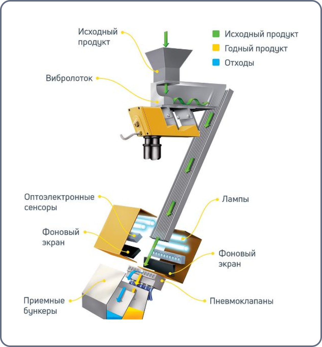 2. По каналам продукт попадает в освещенную зону обследования и осматривается высокотехнологичными сенсорами или CCD-камерами. Сенсоры (или камеры), получая отраженный свет от материала отбора, генерируют электрический сигнал для компьютерной системы управления.