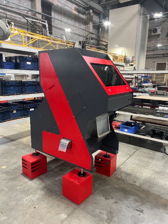 Важное отличие новой разработки — ориентированность на ручной труд. Если на крупных предприятиях сырье подается в фотосепаратор с помощью конвейеров и транспортеров, то на небольших производствах оператору приходится работать с ведрами и мешками. В стандартной полногабаритной машине это означало постоянные подъемы по лестнице, что создавало дополнительную нагрузку на сотрудников. В новой версии высота рамы уменьшена, а выгрузка отсортированного продукта организована таким образом, что оператору не приходится совершать лишних перемещений по производственному помещению.
