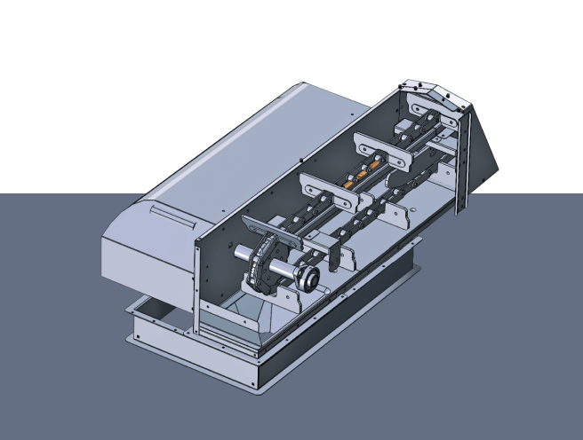 Транспортер предназначен для транспортировки в горизонтальном направлении зерна, продуктов его переработки и твердых сыпучих продуктов. Перемещает материал с помощью цепи, толкая его.